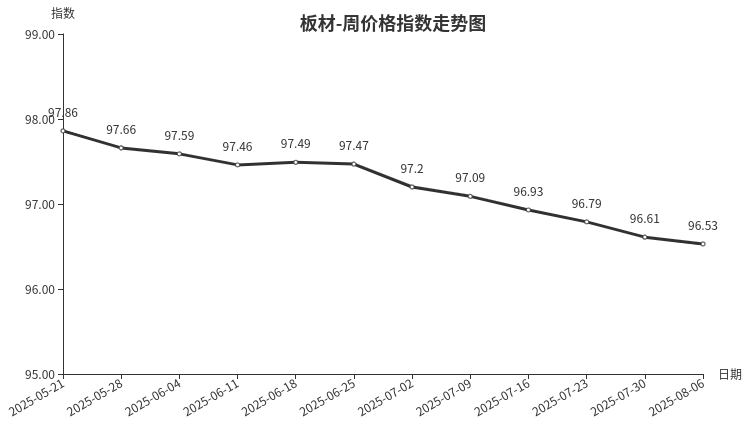 本周,板材类周价格指数收于96.53点,环比下跌0.08点,从盘面看,材料板材、周转板材价格小幅下跌。近期受持续性高温天气影响,板材产品需求偏弱,市场交易主要以家工装施工单位小规模集中采购以及散户零售为主,另外随着橡胶、原木等原材料价格回落,部分产品销售价格小幅下调,带动平均销售价格下跌。