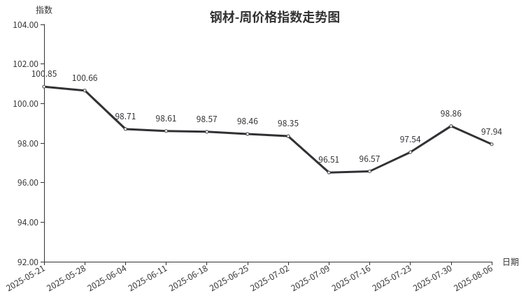 本周,钢材类周价格指数收于97.94点,环比下跌0.92点,三级分类中建筑钢材类、板材类、型材类、管材类均环比下跌。本周钢材类指数小幅回调,上游原材料价格下降,成本支撑较弱,市场钢材价格小幅下跌,下游需求端未有明显改善,市场成交情况表现不佳。