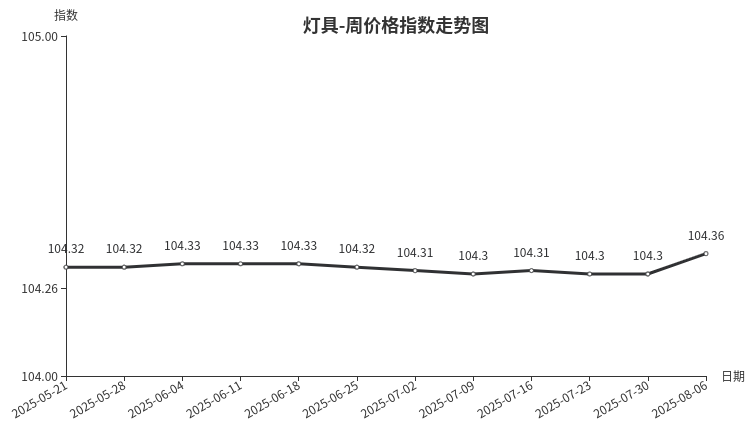 本周,灯具类周价格指数收于104.36点,环比上涨0.06点,主要是灯具配件、户外照明带动价格上涨,家居照明价格微涨。近期灯具采购需求略有下挫,灯头、光源、室外灯带、中高档道路灯、家居台灯成交量下滑,价格优惠力度减小,加之配套销售环节上调中高端产品价格,拉动平均成交价上涨。