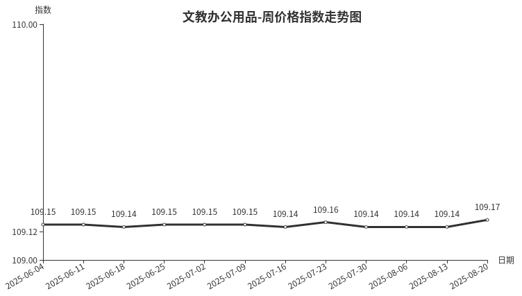 本周,文教办公用品类周价格指数收于109.17点,环比上涨0.03点,从盘面看,文化办公用品均小幅上涨,其中文教用品涨幅较突出,体育娱乐用品保持平稳。随着开学季临近,书写工具、文教用品、纸制品等产品需求释放,中下游经销商积极备货,散户客流量增加,价格小幅上涨;另外受产品更新换代影响,部分新上市电子产品价格居高,带动平均价格上涨。