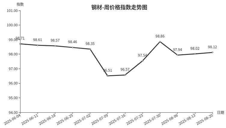 本周,钢材类周价格指数收于98.12点,环比上涨0.10点,分类中管材类小幅上涨,板材类、建筑钢材类、型材类环比下跌。本周,钢材类指数继续上涨,其中管材类小幅走高,上游钢厂出场价格上调,现货市场价格稳中有涨,但市场淡季明显,整体交易清淡。