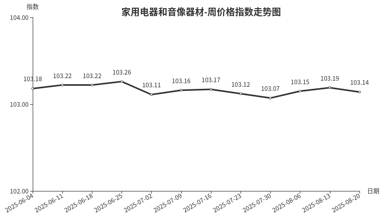 本周,家用电器和音像器材类周价格指数收于103.14点,环比下跌0.05点,从盘面看,制冷电器、净化电器价格降幅较大。制冷电器中空调、展示柜等行情走低,成交量进一步缩减,价格缺乏支撑,下跌幅度较大;净化电器中净水机降价促销,销量小幅上涨。