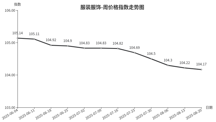 本周,服装服饰类周价格指数收于104.17点,环比下跌0.05点,分类中服饰类价格出现下跌,服装类价格与上期持平。夏季尾声,服饰中的鞋类价格下跌明显,凉鞋等夏季品类因滞销进入“疯狂促销期”,成交价格连创新低。