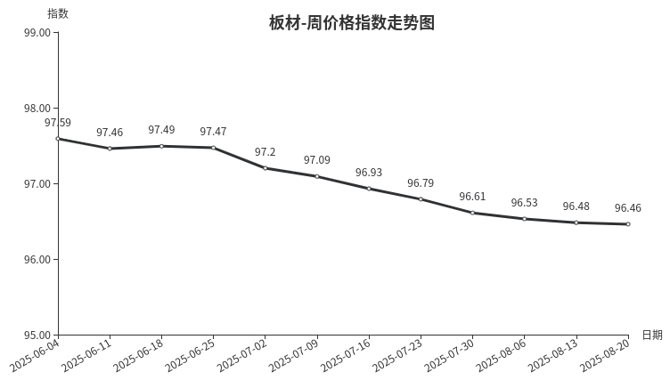 本周,板材类周价格指数收于96.46点,环比下跌0.02点。从盘面看,材料板材周价格指数环比下跌0.02点。受近期持续性高温天气影响,市政工程、家工装等行业施工进度放缓,板材产品市场需求偏弱,市场交易量减少,另外随着原木、铝型材等原材料价格回落,部分产品出厂价格下调,带动平均销售价格下跌。
