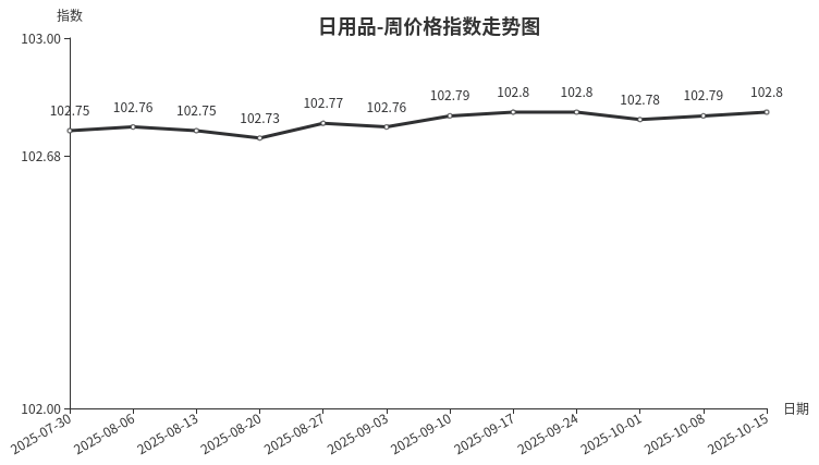 本周,日用品类周价格指数收于102.80点,环比上涨0.01点。分类中箱包、护理及美容用品、针纺织品等价格出现上涨。箱包处于销售旺季,拉杆箱、书包等产品价格稳中有升;护理及美容用品因新品集中上市,价格小幅上扬;受换季需求推动,针纺织品中的秋冬床上用品销售升温,均价上涨;而工艺品、首饰因节后需求回落,销量与价格同步下滑。
