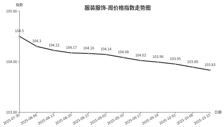 本周,服装服饰类周价格指数收于103.83点,环比下跌0.06点,二级分类中,服装类和服饰类指数均出现下跌。服装市场价格指数再创新低,男女装及部分服饰类配件价格比较坚挺,女童装因换季上新,部分款式打折促销导致价格下跌;腰带、运动鞋受库存积压影响,商家降价清货。