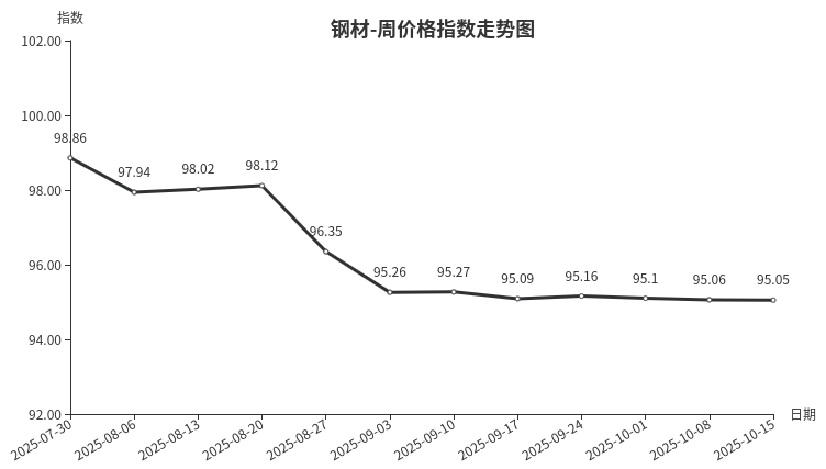 本周,钢材类周价格指数收于95.05点,环比下跌0.01点,三级分类中板材类、建筑钢材类环比下跌,型材类微涨,管材类与上周持平。上游钢材期货市场、原材料价格下跌,现货市场钢材价格跟跌;近期雨水天气偏多,终端需求依然疲软,车流量、走货量较少,市场整体交易清淡。