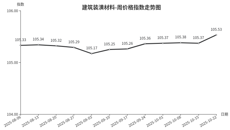 本周,建筑装潢材料类周价格指数收于105.53点,环比上涨0.16点,二级分类中装饰材料类、结构安装材料类环比上涨。受上游原材料价格上涨影响,铝型材生产厂家提高产品出厂价格,市场铝型材价格跟涨,但市场销售量未见明显增长;墙纸类销售以零售为主,价格震荡上行。