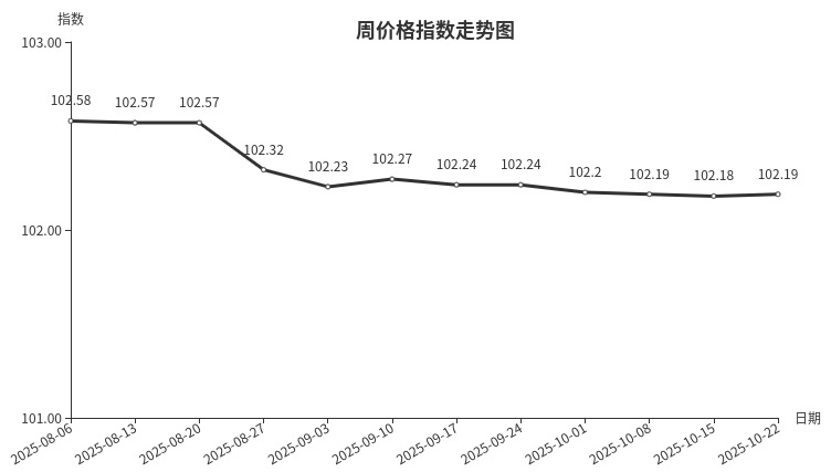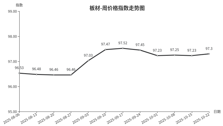 本周,板材类周价格指数收于97.30点,环比上涨0.07点。从指数构成要素看,材料板材中密度板、铝塑板涨幅较为明显;周转板材保持稳定。随着季节转换天气渐冷,市政工程、家工装行业施工进度加快,密度板、铝塑板等产品需求释放,市场散户客流量增加,带动平均销售价格小幅上涨。