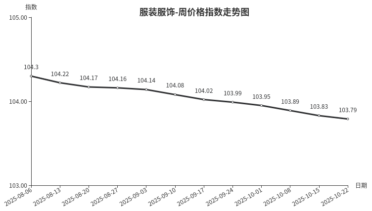 本周,服装服饰类周价格指数收于103.79点,环比下跌0.04点。二级分类中服装类指数持平,服饰类指数小幅下跌。服装类价格表现平稳,仅内衣、男装受批发业务增多影响,成交价格微降;腰带、鞋受市场需求变动及批发占比上升的双重影响,成交均价跌幅明显,导致服饰类指数走低。
