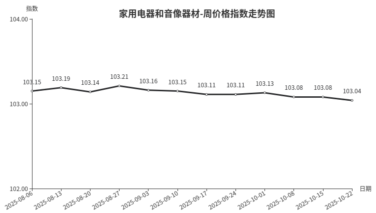 本周,家用电器和音像器材类周价格指数收于103.04点,环比下跌0.04点,分类中厨房电器指数降幅较大,热水器、音像器材微降,制冷电器、个人生活电器、净化电器指数上涨。家电市场行情依然偏淡,厨房电器中电炒锅、电压力锅走货较慢,价格下跌;热水器适时进行降价促销,效果较好。