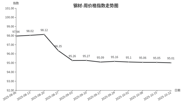 本周,钢材类周价格指数收于95.01点,环比下跌0.04点,三级分类中板材类、建筑钢材类环比下跌,型材类、管材类与上周持平。钢材类价格稳中有跌,市场行情不及预期,建筑工程类、基建工程类开工不足,下游终端需求有限,市场整体交易量偏少,钢材价格缺乏上涨支撑。