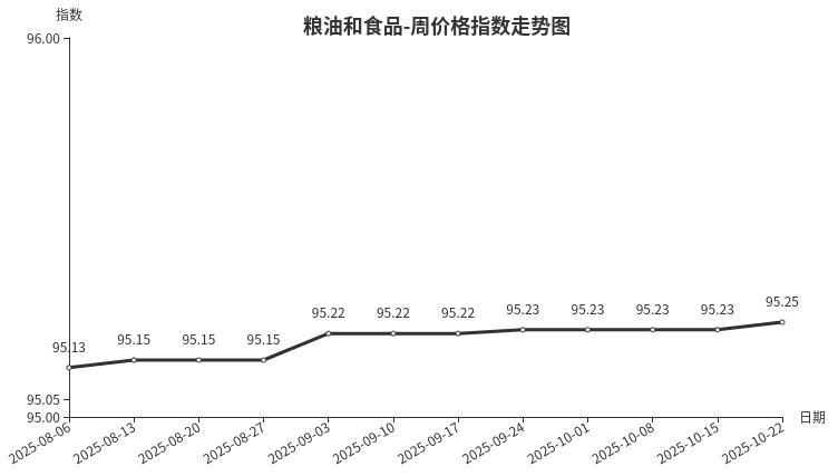 本周,粮油与食品类周价格指数收于95.25点,环比上涨0.02点。分类中干果、调味品价格出现上涨,粮油、茶叶价格持平,副食价格微跌。干果类量价齐升,且涨幅明显;调味品类中的香辛料、酱油、蚝油零售占比增加,带动价格走高;其他品类价格变动不明显。