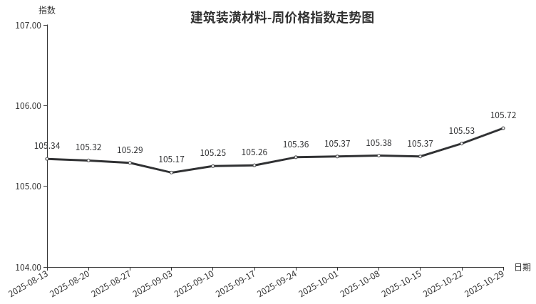 本周,建筑装潢材料类周价格指数收于105.72点,环比上涨0.19点,二级分类中装饰材料类、专用材料类环比上涨。上游原材料铝锭价格上涨,铝型材出厂价格上调,市场铝型材价格继续上行;户外温度降低,保温材料类需求逐渐增加,成交量环比增加,价格稳中有升。