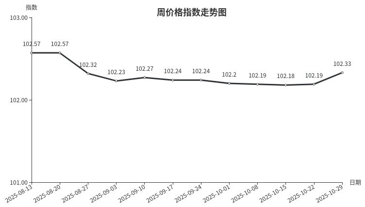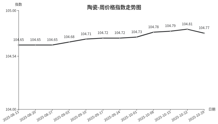 本周,陶瓷类周价格指数收于104.77点,环比下跌0.04点,其中陶瓷洁具和日用陶瓷餐具价格下跌。进入10月下旬,陶瓷行情明显回落,特别是日用陶瓷餐具主销的碗、盘销量下滑,成交价格有所下跌;陶瓷洁具目前走量稳中有降,为促进配套销售,价格适时下调。