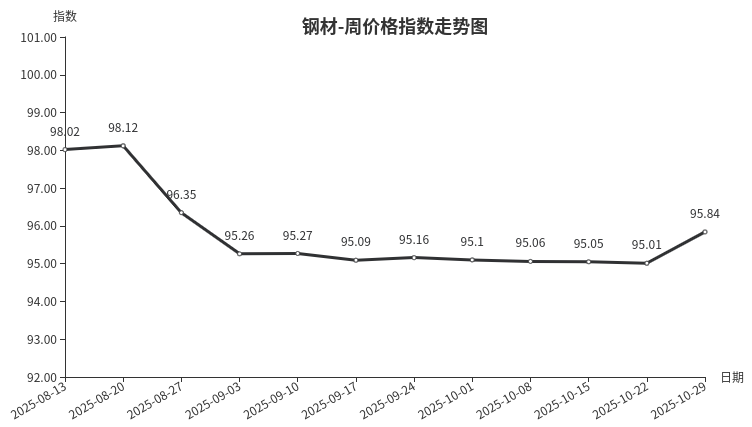 本周,钢材类周价格指数收于95.84点,环比上涨0.83点,三级分类中型材类、建筑钢材类、板材类、管材类均环比上涨。钢材类价格小幅上涨,上游原材料价格震荡上行,钢材生产成本加大,市场钢材价格跟涨,下游经销商备货增加,市场销售量环比上涨。