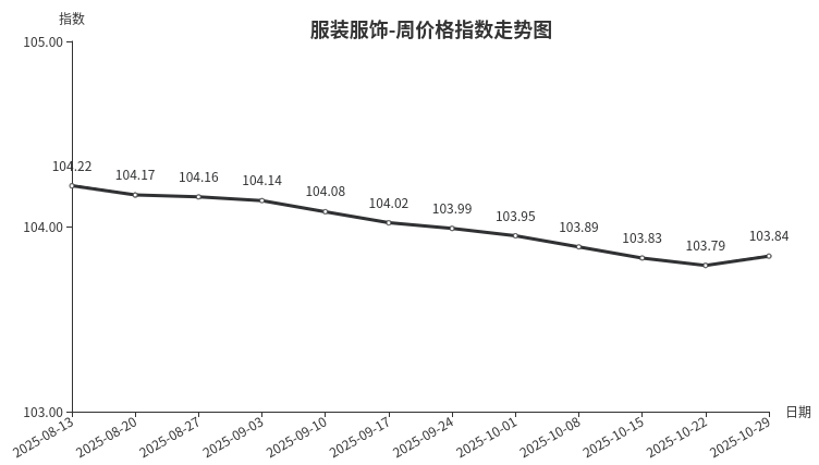 本周,服装服饰类周价格指数收于103.84点,环比上涨0.05点。二级分类中,服装类和服饰类指数均出现上涨。服装涨幅明显,因近期温度骤降,冬季保暖内衣需求激增,价格随市上涨;服饰中的鞋换季刚需采购较多,价格小幅上扬。