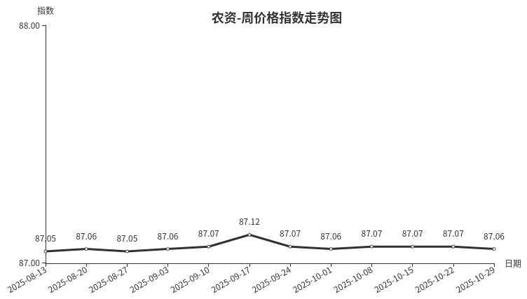 本周,农资类周价格指数收于87.06点,环比下跌0.01点。分类中农药、兽禽用药价格出现下跌,农膜、养殖器具、种子价格与上周持平。杀鼠剂、植物生长调节剂本周销量上涨,批发放量致成交均价下行;降温后,养殖动物应激反应显著,泌尿生殖系统药、调节组织代谢药物的批发量随之增加,价格也顺势下调。