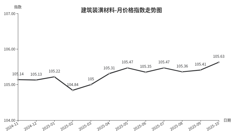 本月,建筑装潢材料类月价格指数收于105.63点,环比上涨0.22点。从盘面看,二级分类中多数上涨,其中装饰材料类、结构安装材料类、专用材料类分别上涨0.23点、0.05点和0.05点,结构材料类与上月持平。10月份,建筑装潢材料类指数先跌后涨,上游原材料铝锭价格上涨,生产成本加大,市场铝型材价格小幅上调,但销售量未见明显增长;户外温度降低,市场保温材料、塑料阀门管件、水暖管件等下游需求逐渐释放,销售价格稳中有涨,销量同步增加。
