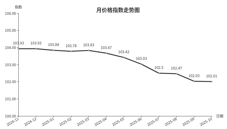 据临沂商城价格指数信息系统监测,本月临沂商城月价格总指数为102.01点,环比下跌0.02点,跌幅0.02%;同比下跌2.00点,跌幅1.92%。