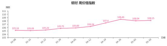 本周,钢材类周价格指数收于108.15点,环比上涨0.11点,涨幅0.10%。从盘面看,钢材三级分类全部出现上涨,其中管材类涨幅最大,指数环比上涨0.18点,板材类、建筑钢材类、型材类指数同步上涨,指数分别上涨0.13点、0.11点和0.08点。