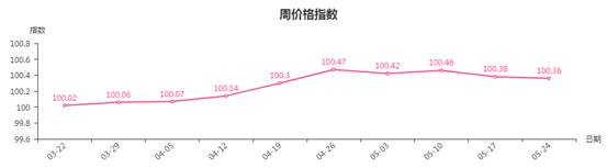 据临沂商城价格指数信息系统监测,本周(5月17日-5月24日)临沂商城周价格总指数为100.36点,环比下跌0.02点。