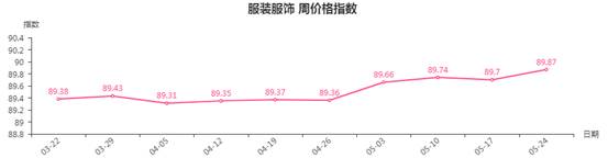 本周,服装服饰类周价格指数收于89.87点,环比上涨0.17点。从盘面看,服装类指数上涨0.23点,三级分类中运动装类、女童装类、男童装类、男装类、女装类指数分别上涨1.18、0.70、0.64、0.27和0.16点,是拉动服装服饰类周价格指数上涨的主要因素。