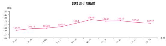 本周,钢材类周价格指数收于107.37点,环比下跌0.29点,跌幅0.27%。钢材指数继续下行但跌幅收窄,三级分类中指数跌多涨少,其中板材类、建筑钢材类、管材类指数出现下跌,指数分别下跌0.92点、0.64点和0.37点,成拉动指数下行主力,型材类不跌反涨,指数上涨0.38点。