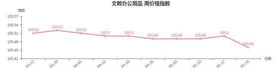 本周,文教办公用品类周价格指数收于105.46点,环比下跌0.04点。其中,体育娱乐用品类指数下跌0.12点,是拉低文教办公用品类指数的主要因素。
