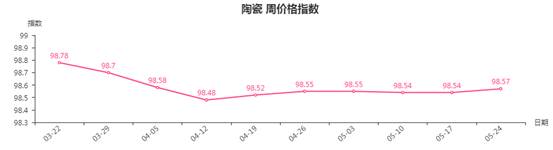 本周,陶瓷类周价格指数收于98.57点,环比上涨0.03点,涨幅0.03%。从二级分类来看:建筑陶瓷类、陶瓷洁具类周价格指数分别上涨0.05点和0.03点。