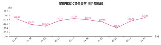 本周,家用电器和音像器材类周价格指数收于100.89点,环比上涨0.16点。其中,净化电器类、电风扇类、厨房电器类、热水器类、家居电器类指数分别上涨2.34、0.25、0.15、0.08、0.01点,制冷电器类、个人生活电器类指数分别下跌0.17、0.05点。