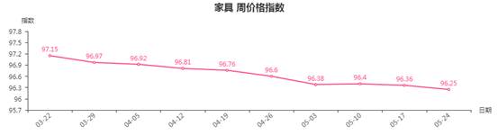 本周,家具类周价格指数收于96.25点,环比下跌0.11点。从盘面看,架类、床及用品类、柜类指数分别下跌0.42点、0.30点、0.28点,是拉动家具类周价格指数下跌的主要因素。