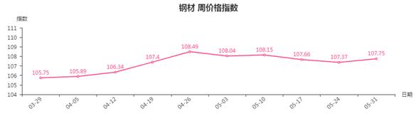 本周,钢材类周价格指数收于107.75点,环比上涨0.38点,涨幅0.35%。从盘面看,钢材三级分类中互有涨跌,其中型材类、建筑钢材类指数分别上涨1.11点和0.14点,拉动整体指数上涨,板材类、管材类指数下跌0.03点和0.50点。