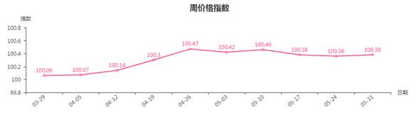 据临沂商城价格指数信息系统监测,本周(5月24日-5月31日)临沂商城周价格总指数为100.38点,环比上涨0.02点。
