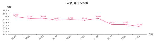 本周,农资类周价格指数收于92.66点,环比下跌0.07点。从盘面看,农膜类、种子类指数分别下跌0.24点、0.02点,是拉动农资类周价格指数下跌的主要因素。