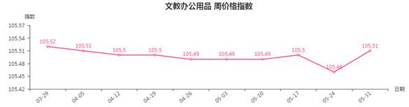 本周,文教办公用品类周价格指数收于105.51点,环比上涨0.05点。其中,体育娱乐用品类和文化办公用品类指数分别上涨0.08点和0.03点,拉动文教办公用品类指数上涨。