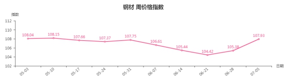 本周,钢材类周价格指数收于107.93点,环比上涨2.55点,涨幅2.42%。钢材指数继续上涨且涨幅略有增大,钢材三级分类指数全部上涨,其中建筑钢材类、管材类、板材类、型材类指数分别上涨3.66点、3.29点、2.97点和1.27点。