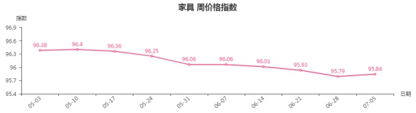 本周,家具类周价格指数收于95.84点,环比上涨0.05点。从盘面看,坐具类、桌类、柜类分别上涨了0.16点、0.05点、0.02点,是拉动家具类周价格指数上涨的主要因素。