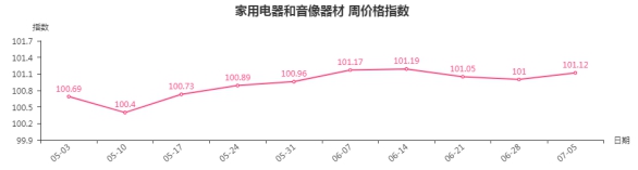 本周,家用电器和音像器材类周价格指数收于101.12点,环比上涨0.12点。从盘面看,净化电器类、厨房电器类、电风扇类、热水器类、个人生活电器类指数分别上涨0.65、0.37、0.12、0.08和0.01点,拉动家用电器和音像器材类指数上涨。