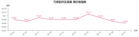本周,汽摩配件及装具类周价格指数收于92.66点,环比下跌0.01点。从盘面看,汽车装饰类、汽车配件类指数均下跌0.01点,摩托配件类指数与上周持平。