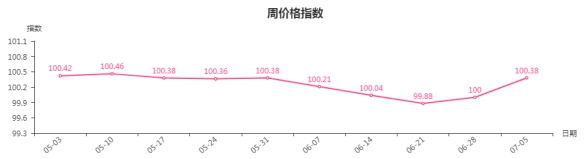 据临沂商城价格指数信息系统监测,本周(6月28日-7月5日)临沂商城周价格总指数为100.38点,环比上涨0.38点。