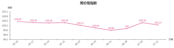 据临沂商城价格指数信息系统监测,本周(7月5日-7月12日)临沂商城周价格总指数为100.23点,环比下跌0.15点。