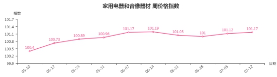 本周,家用电器和音像器材类周价格指数收于101.17点,环比上涨0.05点。其中,制冷电器类、热水器类、厨房电器类、家居电器类指数分别上涨0.56、0.23、0.22和0.03点。