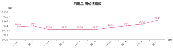 本周,日用品类周价格指数收于99.46点,环比上涨0.04点。从盘面看,玩具类、工艺品类、厨房用品类指数分别上涨0.22、0.08、和0.06点,是拉动日用品类指数上涨的主要因素。