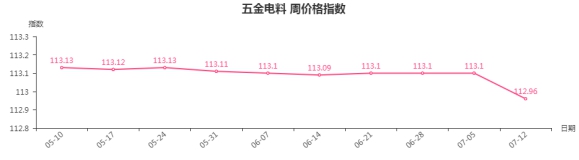 本周五金电料类指数出现下行,进入夏季,五金市场处于销售淡季,下游需求大幅减少,降价消化库存,部分商品价格下跌。从市场具体规格品看,美华250*35*32砂轮价格环比下跌7.40%,ka1809门锁价格环比下跌0.20%,五孔开关价格环比下跌0.20%。