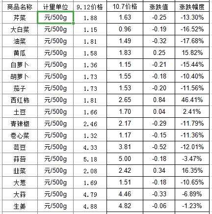 两节期间,我市蔬菜市场整体呈回落趋势,监测的17种菜价13降4涨,平均价格2.34元/500g,较中秋前价格降幅3.84%。其芹菜、大白菜、油菜、白萝卜等10个品种价格回落明显,降幅均超10%,西红柿、黄瓜、韭菜价格涨幅稍大,均超15%。