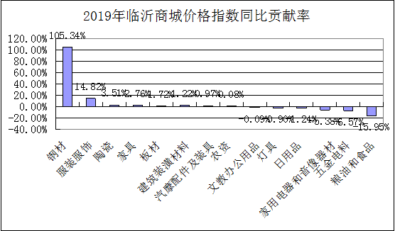 从对价格总指数贡献率看,临沂商城价格指数同比下跌主要受钢材类、服装服饰类、陶瓷类影响,贡献率分别为105.34%、14.82%、3.51%(见下图)。