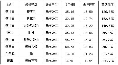 2月9日,全市监测超市的55个主要居民生活消费品价格较去年同期(2月7日)37涨2平16降,平均变动幅度上涨25.99%,总体价格明显高于去年同期。其中,肉类和蔬菜价格大幅上涨,是今年总体价格处于高位的主要影响因素,鸡蛋价格明显低于去年同期价位,其余商品价格相对稳定。