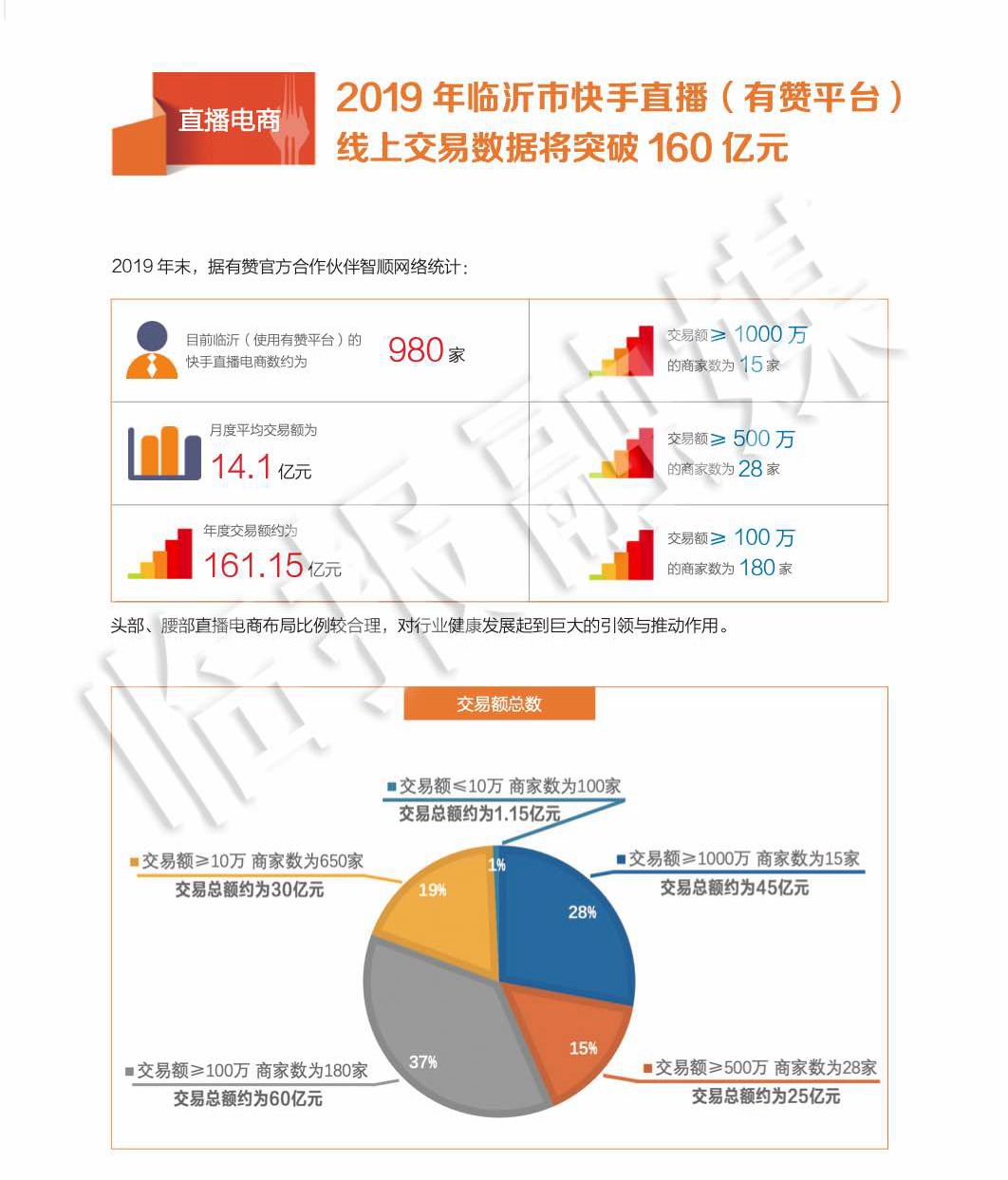 2019年,临沂电子商务交易规模不断扩大,全市网络零售总额实现304.2亿元,同比增长19.2%,位列全省第3位。全市网络零售店铺数超过17万家、较上年同期增长1.5倍,创新创业氛围浓厚。短视频、直播电商等新业态新手段层出不穷,新建成了顺和直播电商小镇、顺和母幼电商直播基地、临谷电商科技创新孵化园、惟业快手电商直播基地等4大短视频直播电商基地。