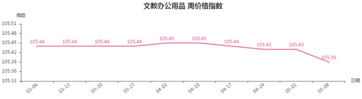 本周,文教办公用品类周价格指数收于105.39点,环比下跌0.04点。二级指数分类中,体育娱乐用品类、文化办公用品类指数分别下跌0.09点和0.01点。